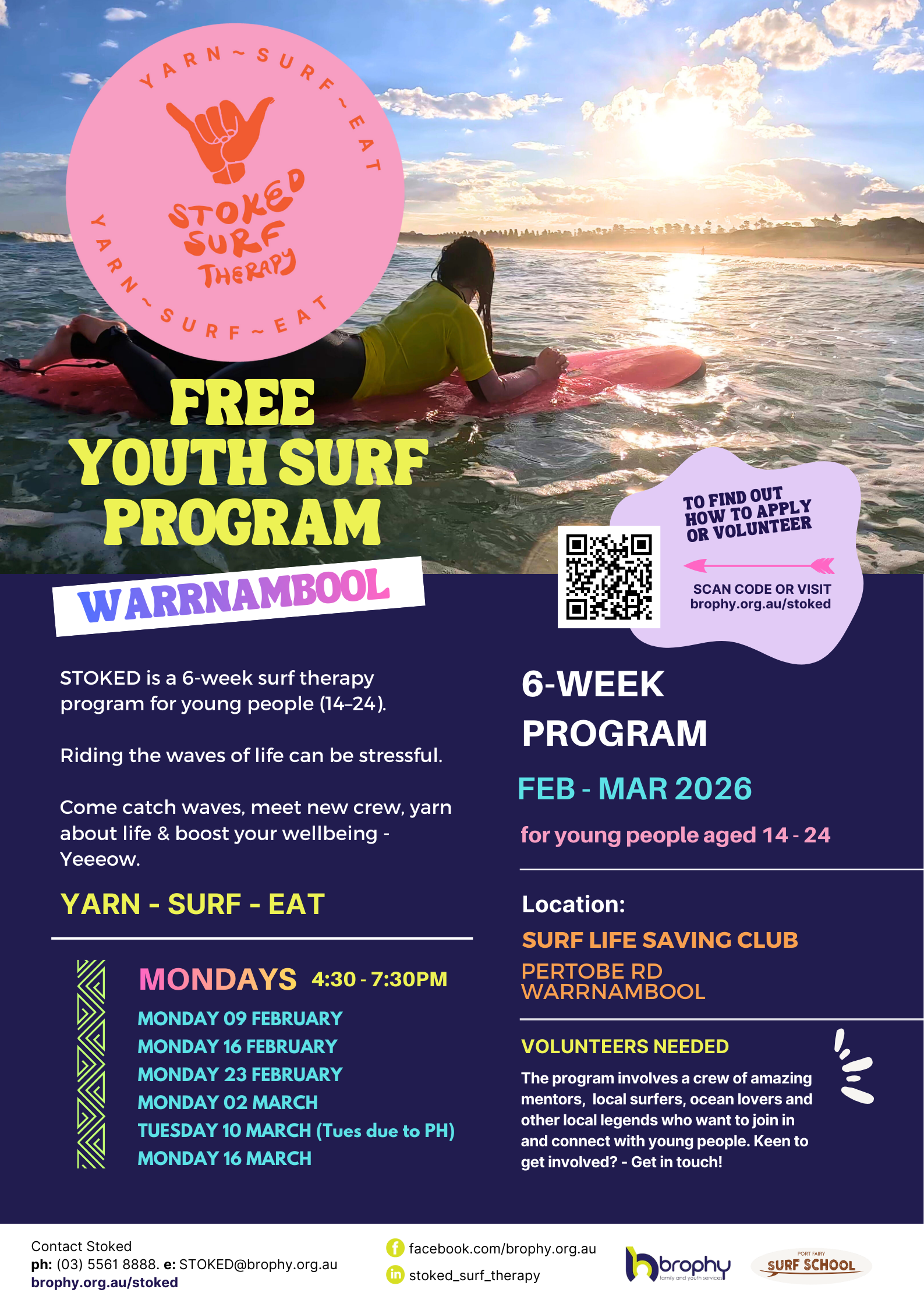 Contact Brophy on (03) 5561 8888 or stoked@brophy.org.au or DWECH on (03) 5521 7535 to sign up for the Portland Indigenous Surf Program.